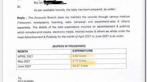 According to the RTI response (F.No.2(1)/RTI/Accounts/DIP/2020-2021dated July 16, 2021, in April this year the AAP government spent Rs 3.42 crores, in May 7.77 crore and in June 62.67 crore in advertisements and other publicity which includes print media, electronic media, internet media and others as a whole under the advertisement and publicity.