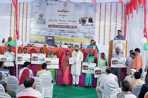 Kumar also distributed 180 Electric Potter’s wheels and 75 Footwear reparing toolkits to pottery and leather artisans at Khadi Gramodyog Vikas Samiti, Marui, Sindhoura, Varanasi and 300 Bee boxes to 30 beekeepers at Akabarpur, Ambedkar Nagar. In order to build a prosperous, strong, self-reliant and happy nation Chairman KVIC motivated the beneficiaries for running their units successfully.